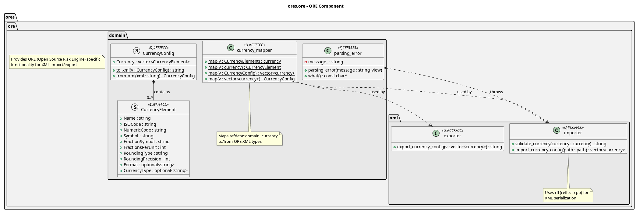 This component provides ORE (Open Source Risk Engine) specific functionality for ORE Studio. It handles import and export of data in ORE's native XML formats.